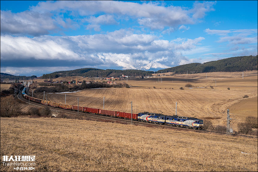 2024年2月,斯洛伐克塔特拉雪山下,ZSSK (斯洛伐克货运) 131级机车牵引混编货列前往科希策方向。该机车由斯柯达共生产50组,为固定双机重联的重载货运机车,主要用于斯洛伐克北部的货物运输。