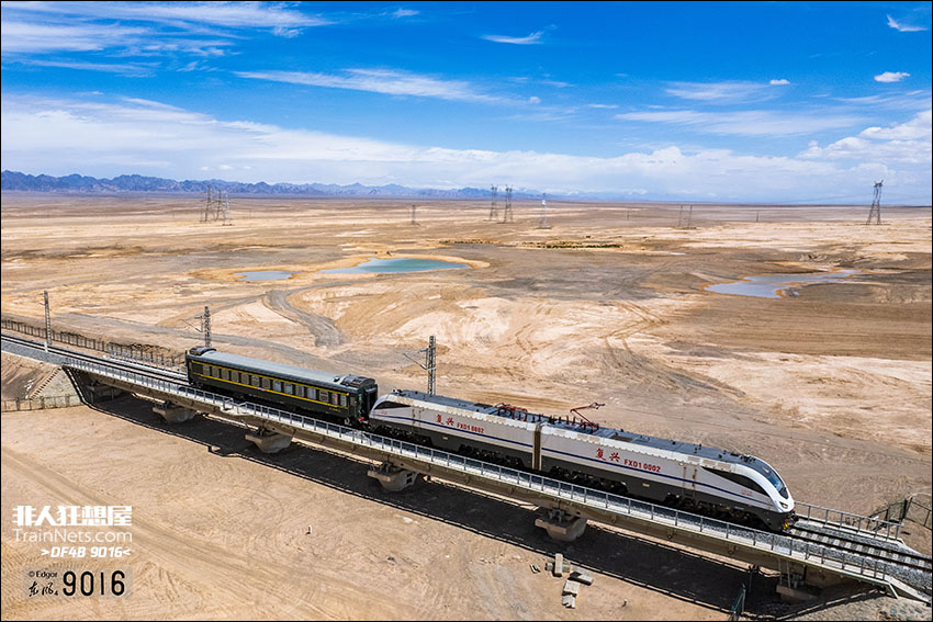 2024年7月,敦煌铁路兰州局管段,57062次通勤列车翻越当金山,行驶在柴达木盆地的茫茫荒漠中。作为当前动力集中型动车组列车动力车的原型车,研制于2015年的FXD1G(原HXD1G)机车如今“发配”敦格线牵引仅一节车厢的通勤列车,也是一种别样的风景。