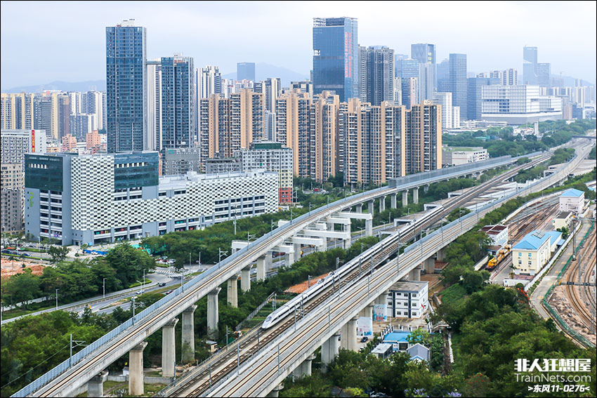 2024年5月2日,繁忙的五一假期期间,一组CRH380AL动车组刚从深圳北站始发,提速行驶在广深港高速铁路一路北上。