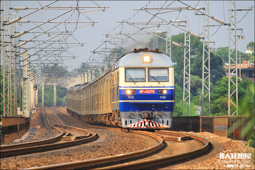 2015年6月5日,南局南段DF11-0276号机车在南京九线赣州境内执行X117次牵引任务,通过沙石大桥往深圳方向。