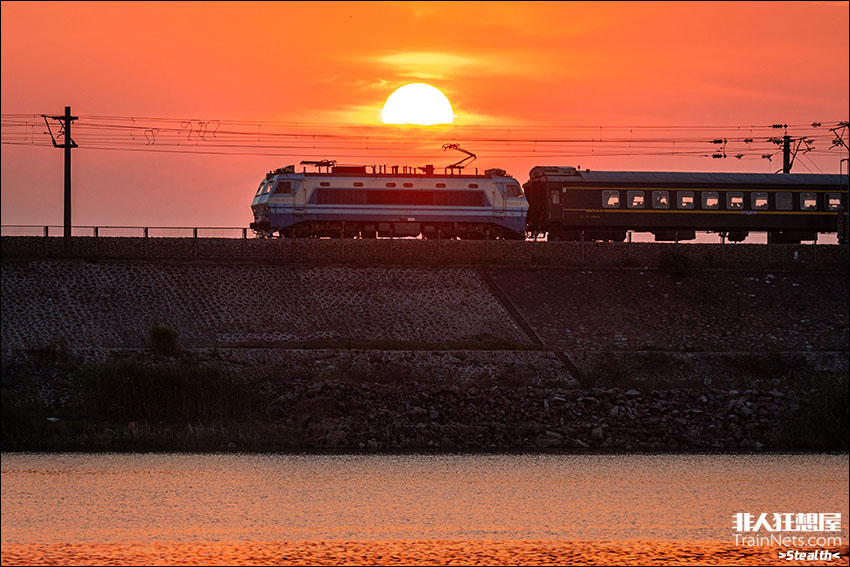 2024年6月15日,湖南岳阳,京广线,广铁长段SS8-0227机车担当的K9217次列车(长沙-深圳)下午从岳阳站始发,在日落时分路过南津港。黄昏烈日烧红了夏至前的天空,是本段时期SS8机车在长岳区间运用的片尾曲。