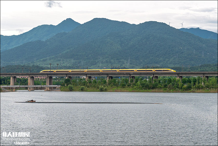2024年6月12日,湖南郴州,京广高速线,复兴号CR400AF-J-0002动检列车开行DJ28次,达速越过仙岭湖,即将通过郴州西站。