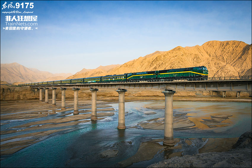 2024年5月3日。青海格尔木。青藏格段NJ2-0023+NJ2-0067牵引Z8992次列车(拉萨-西宁)于日出时分驶过青藏铁路雪水河桥。