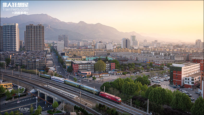 2024年4月18日。辛泰线。清晨,济南局“共青团号”机车牵引检测列车驶出泰山站,检测辛泰铁路等线路。