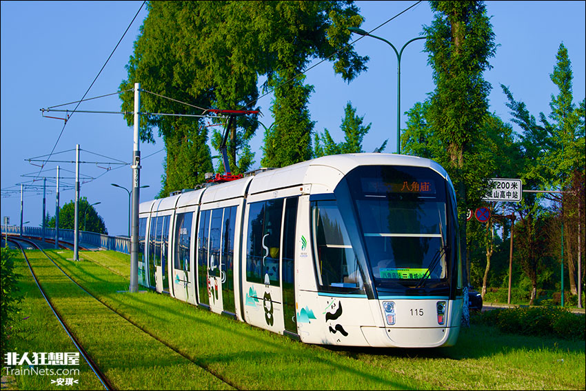 2024年8月。都江堰M-TR旅游线有轨电车驶入青城山中学站。