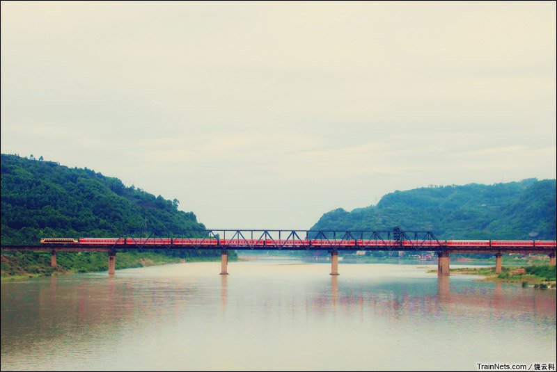 2014年6月8日。客车K113次,成都-昆明通过成昆铁路青衣江大桥。(图/饶云科)