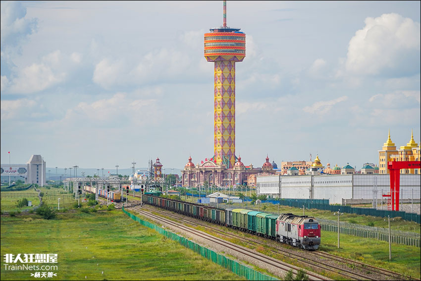 2024年8月18日,满洲里国门,结束入境检查的俄铁列车缓缓驶出,背后是繁华的国门景区北疆明珠观光塔。
