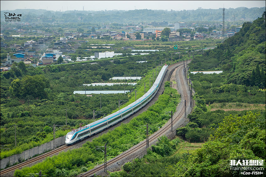 2024年8月11日,四川夹江,CR220J动车组重联行驶在成昆线上执行试验任务,即将通过双福站。