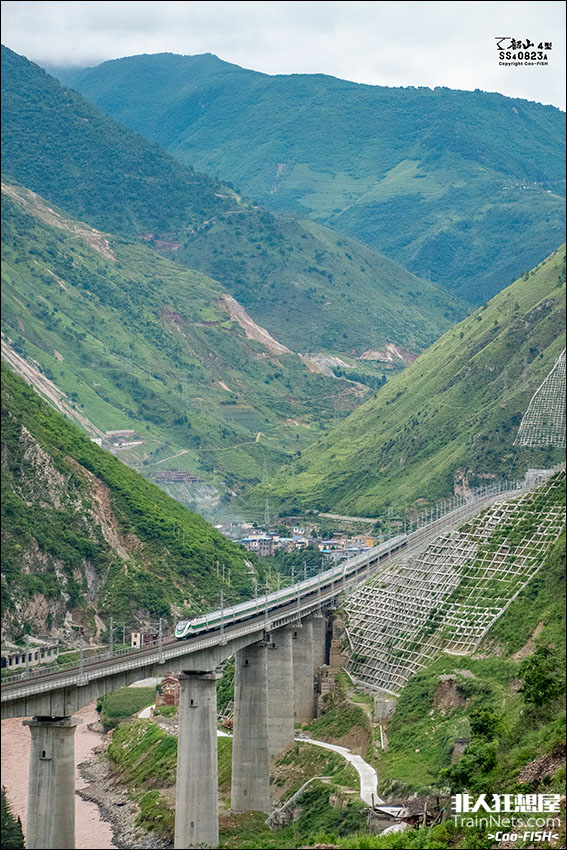 2024年7月27日,四川甘洛,第三代CR200J3-C动集列车重联飞驰在新成昆铁路上,两侧青山连绵,其下牛日河蜿蜒。