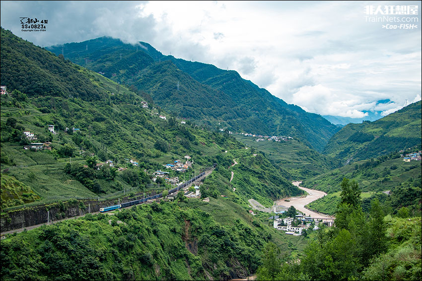 2024年7月28日,四川甘洛,SS4G牵引货列驶过老成昆线阿寨站,夏日的大凉山一片翠绿,牛日河在河谷中蜿蜒不断。