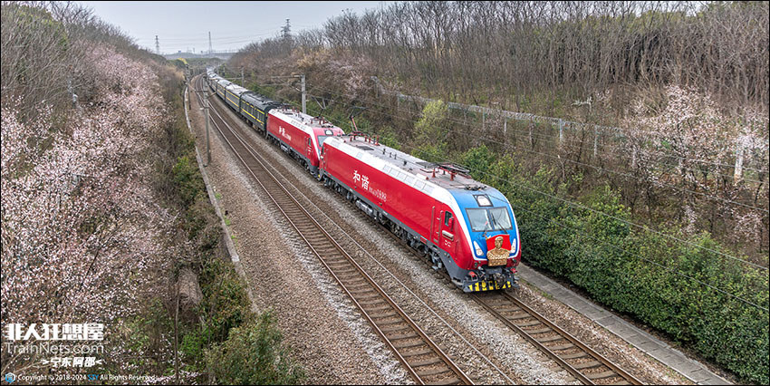 2024年3月,京沪线丹阳段客车K1556次(上海-南宁)达速行驶,穿过一片盛开的桃林。