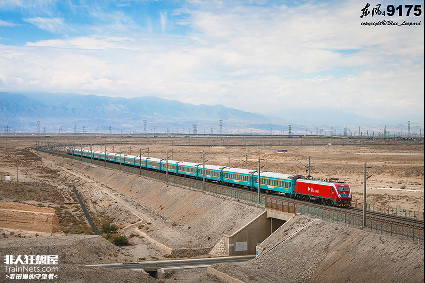 2024年8月1日。甘肃嘉峪关。兰局兰段HXD1D-0088牵引Y458次熊猫专列“什邡号”(吐鲁番-成都西)驶过兰新铁路K743+719。