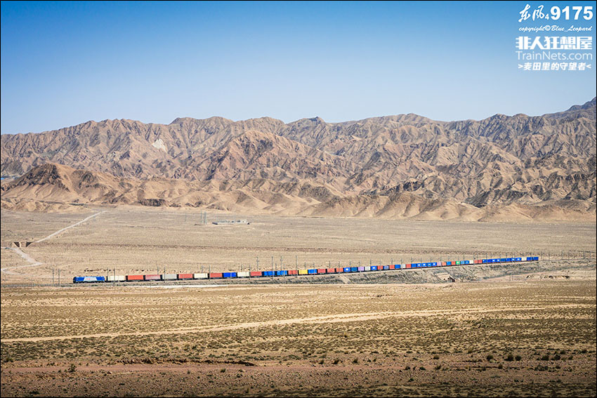 2024年5月4日。甘肃金昌,兰局HXD1C牵引集装箱货列驶过兰新铁路K371。