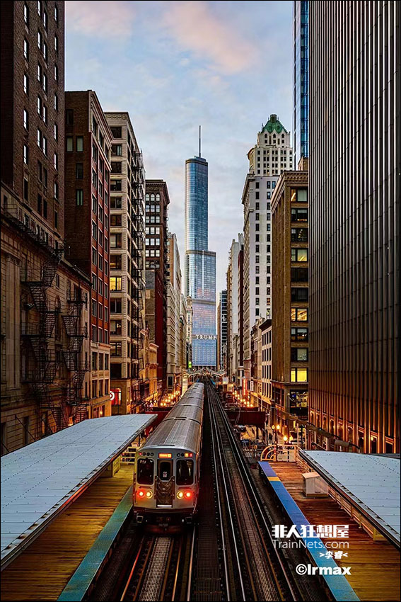 2023年。芝加哥是摩天大楼的故乡,蜿蜒穿梭其中的芝加哥地铁仿佛现实版折叠都市。远处是特朗普大厦。