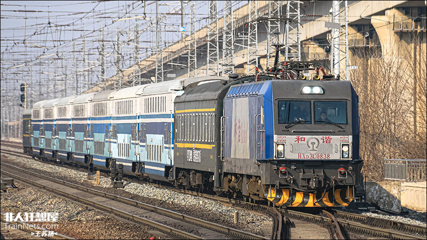 2024年1月30日。淮南线。HXD3C牵引双层快速通过双墩。