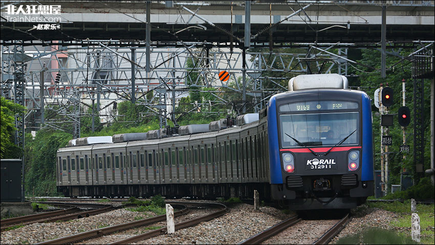 2024年8月,韩国首尔。首都圈电铁1号线上行驶的312型电车。