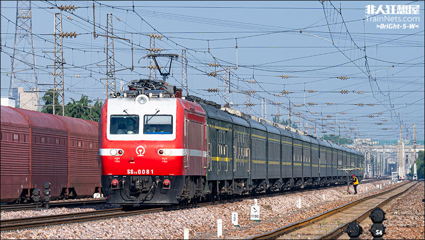 2024年5月2日,清晨,SS7E-0081牵引T198次(乌鲁木齐-郑州)达速通过关帝庙站。