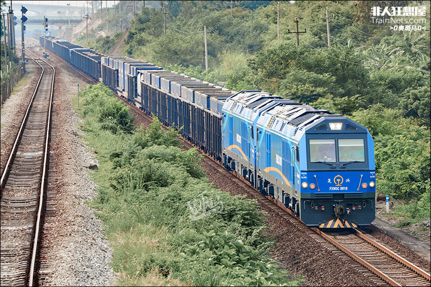 2024年9月11日。广东三水。广铁新到FXN5C-0018,0019双机牵引试运行货列55002次,快速通过三水西站,前往终点江村方向。