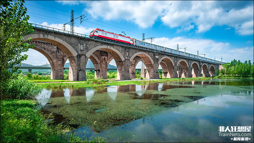 2024年8月2日。济南。京沪线,SS9牵引行包快运X111次跨过始建于1911年的津浦铁路金山铺石拱桥,驶向界首车站。红色的机车与银色的行包列车为这座历经百年风雨而屹立不倒的石桥增添了一抹新时代的亮色。