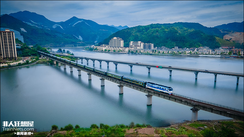 2024年5月3日。金温温段DF4B-9493牵引旅客列车跨越三江并流之处,穿行于青田三溪口境内的苍山瓯海之间。