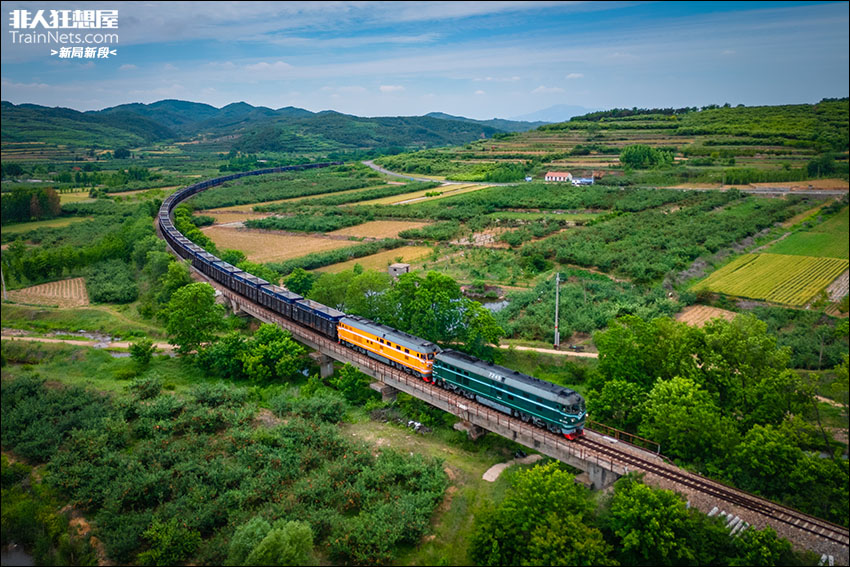 2024年5月30日,“绿瓜黄橘”组合轰鸣穿行在胶东丘陵的果林之间。威局威段DF4B-7245重联DF4B-2684牵引货物列车行驶在桃威铁路桃村东-诸往区间,驶过乳山西井口村附近的田园弯道。