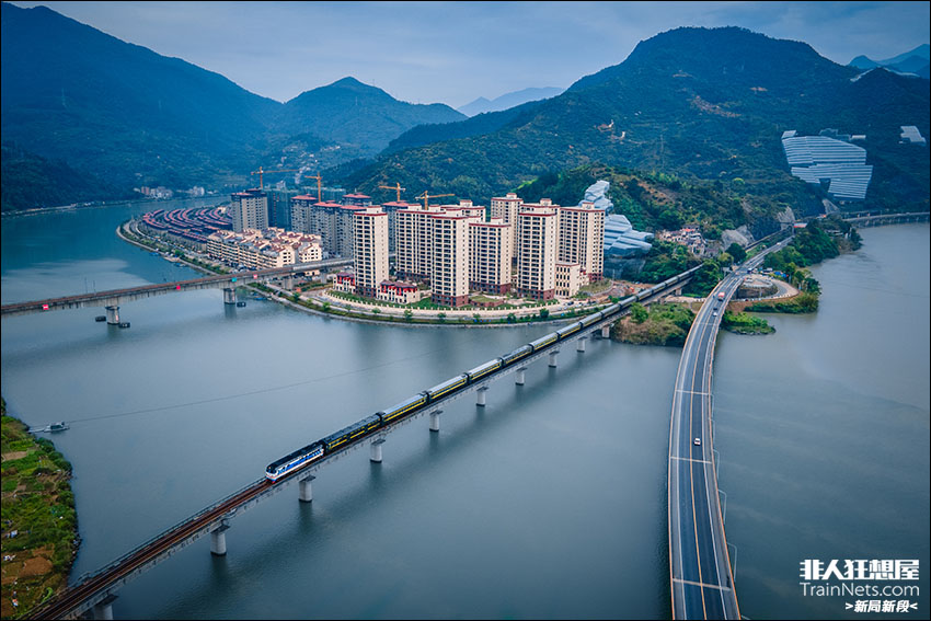 2024年5月3日。浙江丽水。金温瓜牵引旅客列车跨越瓯江,在浙南山水的环绕中缓缓接近青田车站。