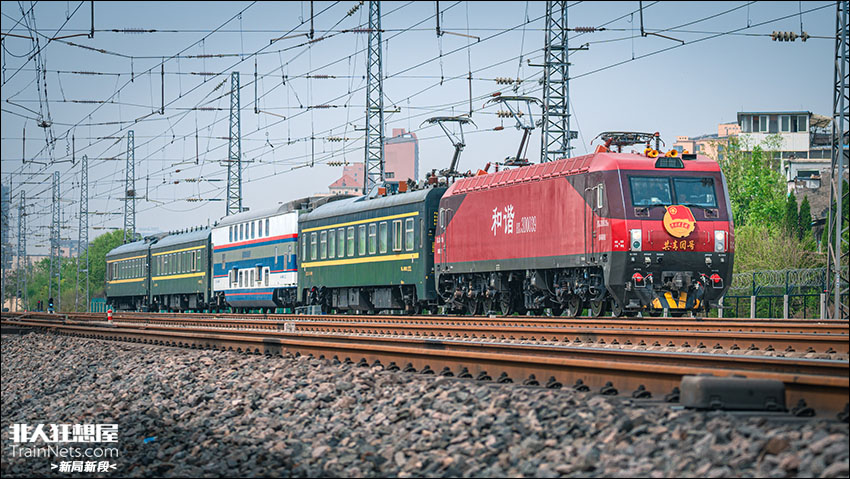 2024年4月19日。济南机务段“共青团号”挂牌机车HXD3D-0039牵引济南局四月月度平推检测列车通过胶济铁路大明湖站。