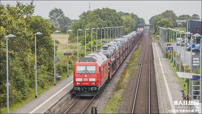 2024年8月。BR245牵引Sylt Shuttle汽车运输车通过叙尔特岛上的Morsum车站。