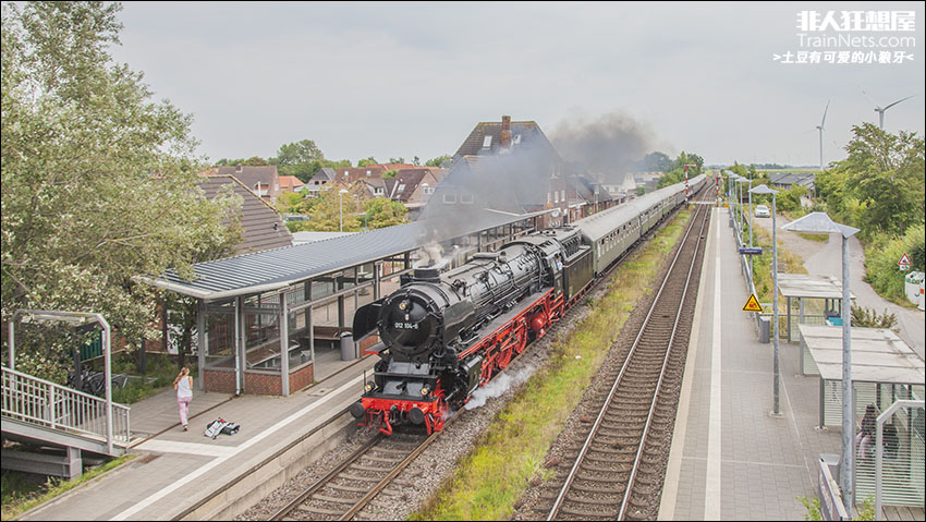 2024年8月。由Historische Eisenbahnfahrzeuge Lübeck e. V.(吕贝克历史铁路车辆协会)组织开行的特别列车,由012 104-6蒸汽机车牵引10节上世纪50/60年代的古董客车前往叙尔特岛。
