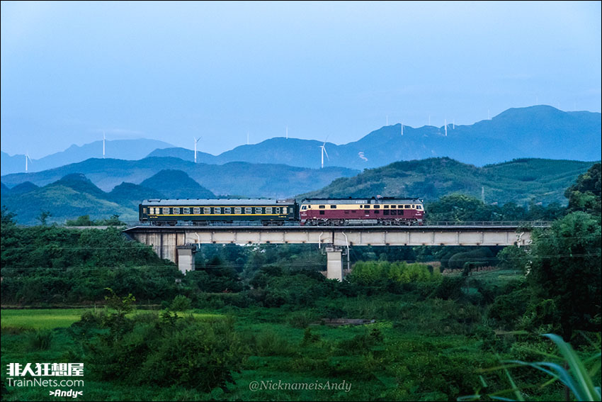2024年7月20日傍晚,益湛线贺州区间,当天下行的永贺通勤车姗姗来迟,赶在日落之前到达贺州市郊附近一处小桥。