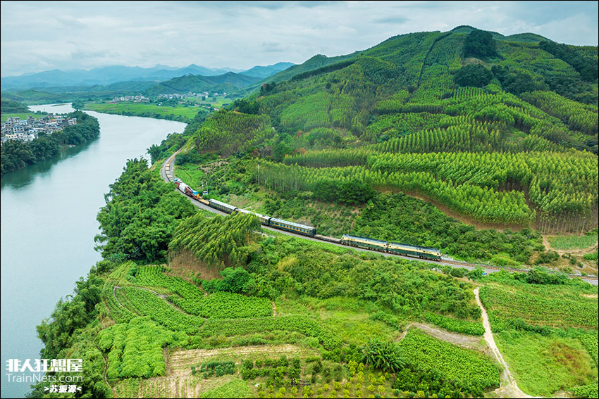 2024年9月。湘桂线。DF4DH-7017+7009牵引超级超限列车行驶在幽兰新村大弯道,列车行驶在幽兰至新村区间是,限速5km/h。