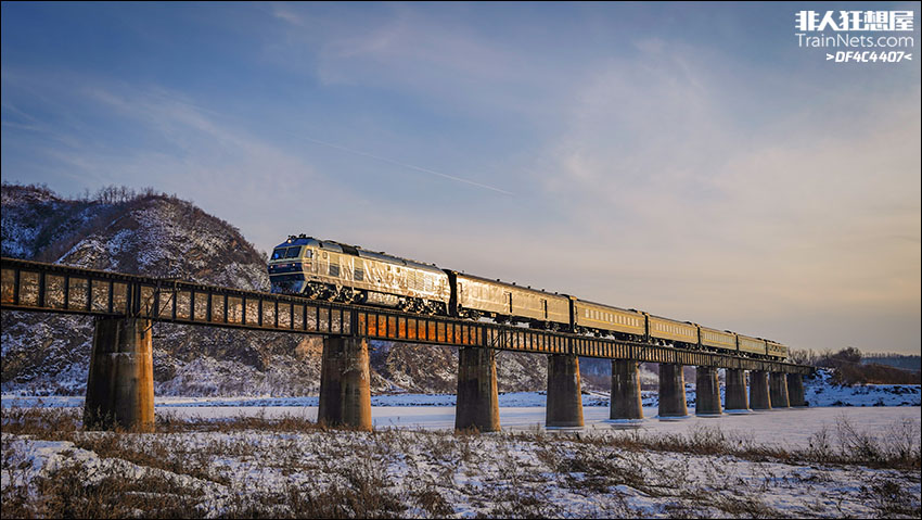 2024年2月2日,辽宁省凤凰城市,凤上线,通化小票4317次(丹东-通化)迎着夕阳驶过有着80余年历史的叆河铁桥。
