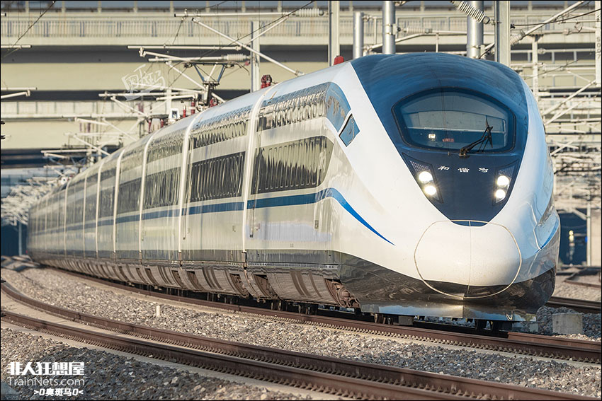 2024年10月1日。广东广州。纵卧CRH2E迎着晨光飞驰在广深线上,前往终点深圳北站方向。