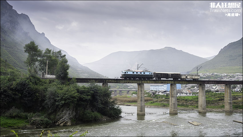 2024年9月16日,朝鲜国铁红旗1号电力机车牵引载人棚车与敞车行驶在北部内陆线上,前往惠山青年站。