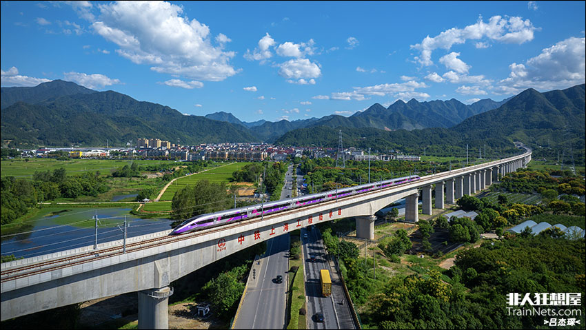 2024年9月13日,C3619次列车(杭州西-温州北)行驶在蓝天白云下的杭温高铁“跨杭黄铁路特大桥”。