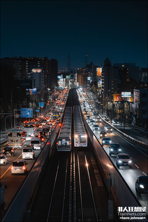 2024年3月30日,大阪府吹田市。大阪地铁21系(左)与30000系在桃山台站附近的铁路公路并行区间。30000系换上了迎接世博的特别涂装。