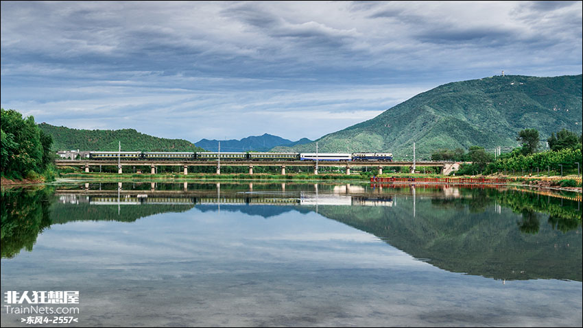 2024年9月。京通线,4471次列车(昌平北-承德)附挂轨道检查车和红外线检测车驶过昌平白浮泉公园。