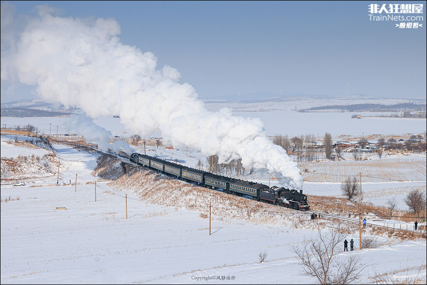 2024年1月31日。辽宁铁岭调兵山。两台上游推挽运行的旅游列车行驶在茫茫雪原之上。