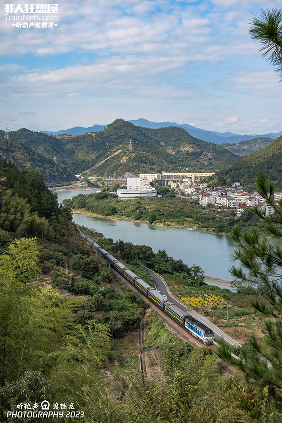 2023年10月,金温货线,K1049次列车(青岛北-温州)行驶在开潭电站下游的大溪河畔。