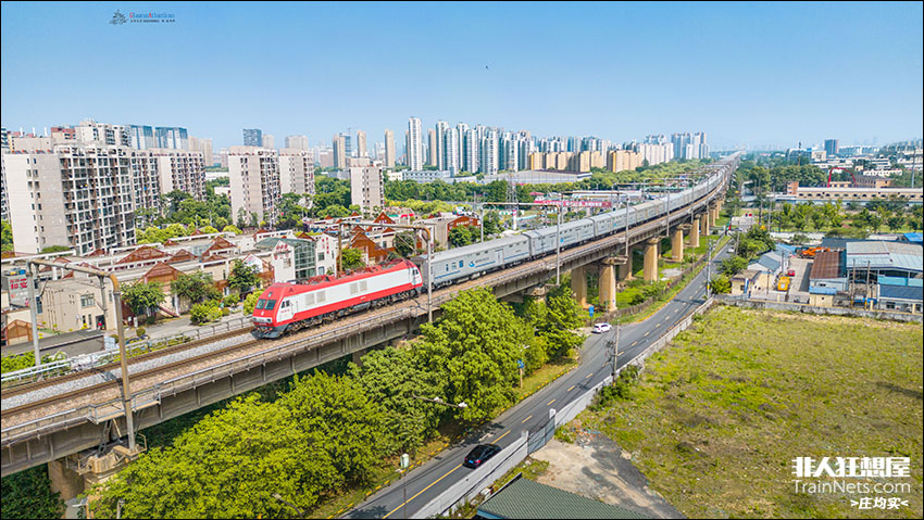2024年4月27日,江苏南京,京沪线,未拆除整流罩时期的上局沪段SS9G-0170牵引X102次驶下南京长江大桥,接近林场站。