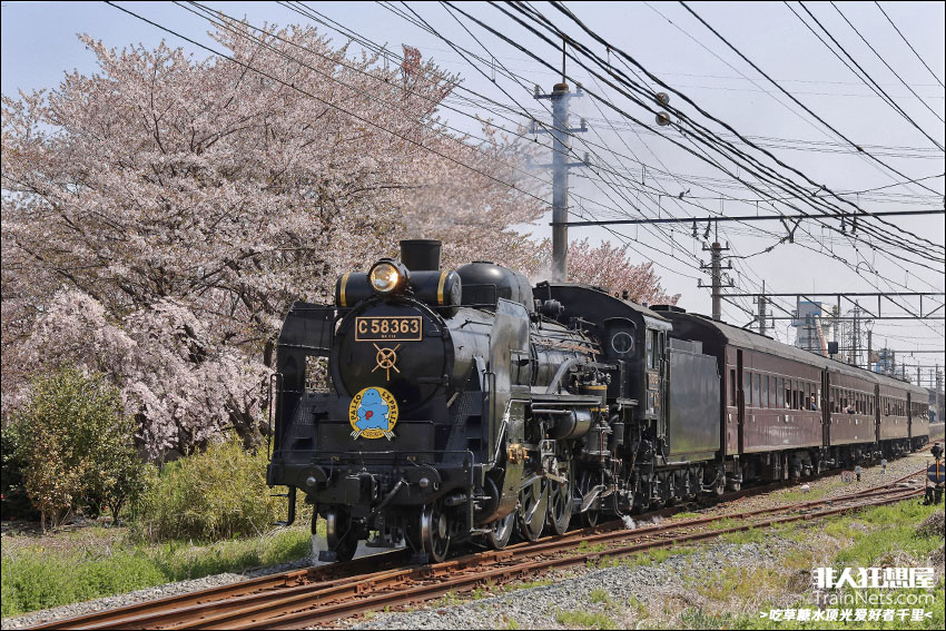 2024年4月14日。秩父铁道。广濑川原机务段C58 363号蒸汽机车,牵引群马车务段所属老旧客车行驶在秩父本线K21公里处,该趟列车为363号机车时隔25年再次牵引老旧客车执行客运任务。开行日樱花盛开,和蒸汽机车一起构成了春日的回忆。