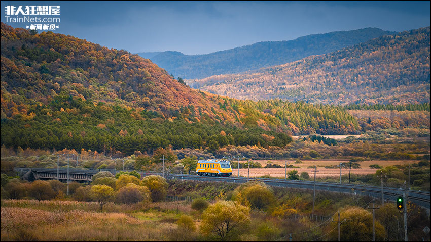 2023年10月4日。伊春市南岔县。金秋时节的绥佳铁路,哈局综合巡检车穿行在小兴安岭五花山的秋色之中,明艳的黄色车身与金黄色的山林融为一体。