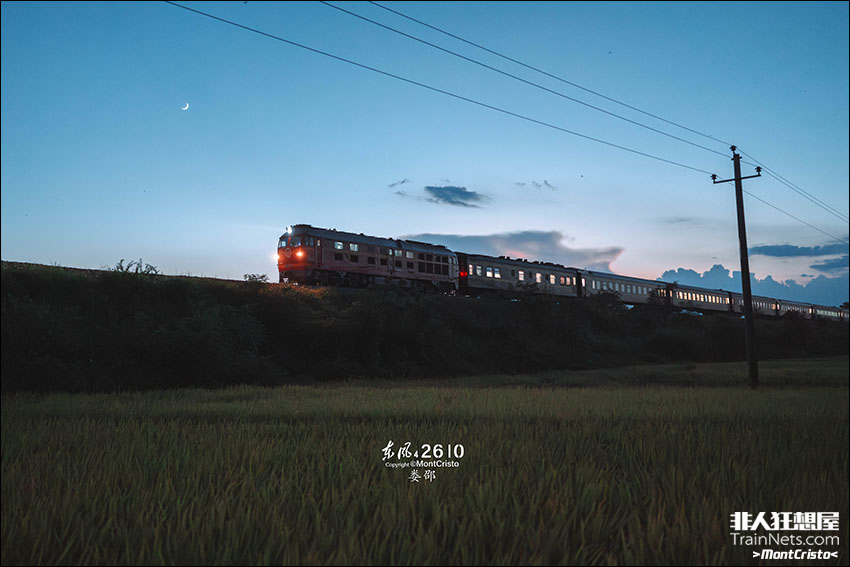 2024年8月7日,益湛线,傍晚永州的稻田里蛙声一片,K1803次列车(武昌-湛江)疾驰而过,恰好与天边的新月同框。