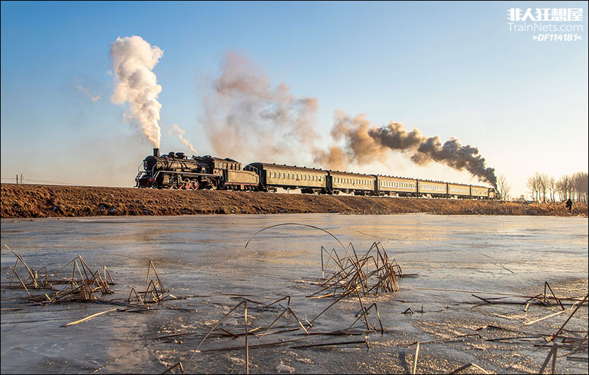 2025年1月,辽宁铁岭,又是一年铁岭调兵山蒸汽机车旅游节,上游1770和1772推挽驶过晓明矿附近的冰湖之上。