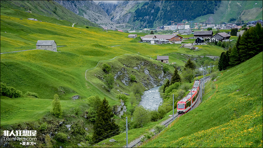 2024年6月1日,瑞士马特洪-哥达铁路 Hospental-Realb区间。列车行驶在高山草甸与溪流之间。著名的冰川快车就行经这一路段。