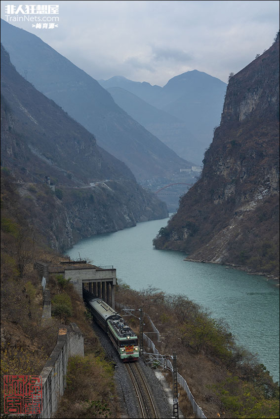 2025年1月。成昆线,成局西段SS3B-5151牵引5619次列车(峨眉-普雄)行驶在大渡河峡谷中接近汉源站。