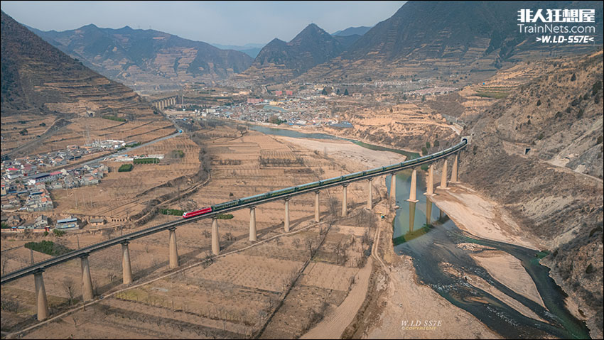 2025年2月,陕西拓石。陇海铁路宝天段,SS7E牵引春运临客,与已废弃的上行旧线分离。