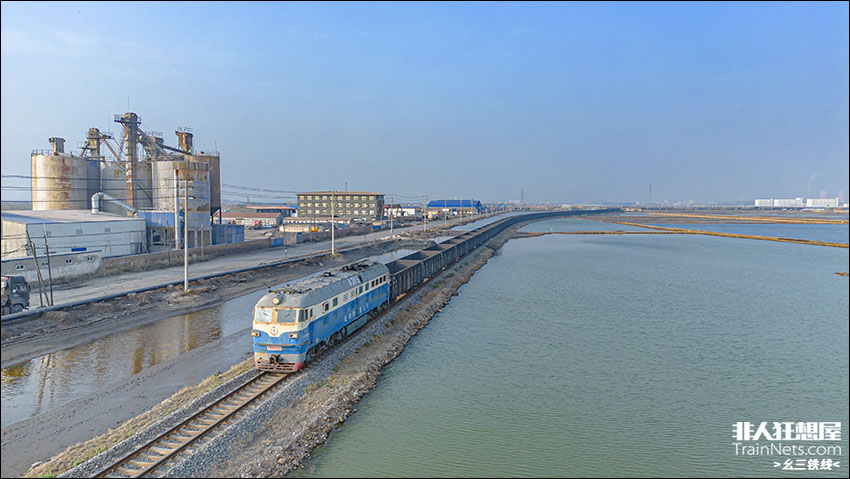 2024年11月3日,沧港铁路,行驶在盐田上的DF4B货物列车。