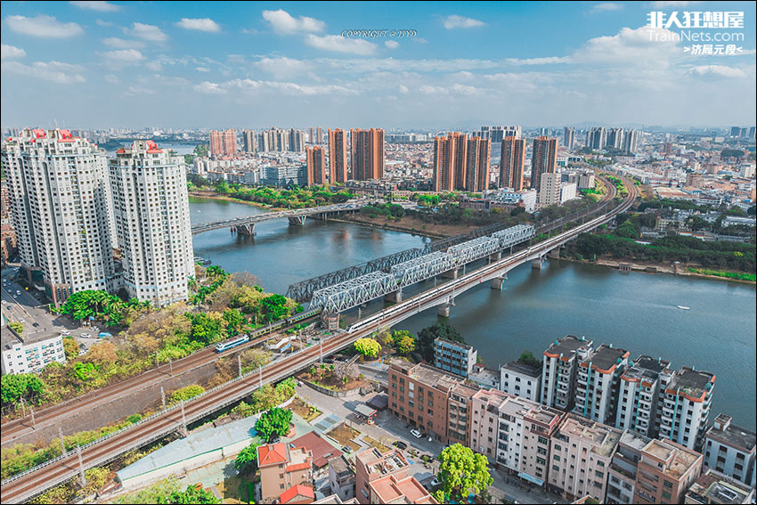 2025年3月,广东东莞。SS8客车与CRH1A动车行驶在广深铁路石龙南桥上。现今东江上由北至南依次矗立着逾百年历史的广九铁路老石龙南桥、九十年代修建的石龙特大桥与2007年开通的广深四线石龙南桥,跨越历史、栉风沐雨的三座桥梁不仅见证了石龙站与石龙地区的风雨历程,也是百年来铁路建设取得跨越发展、准高速运营在广九铁路“先行先试”的实地写照。