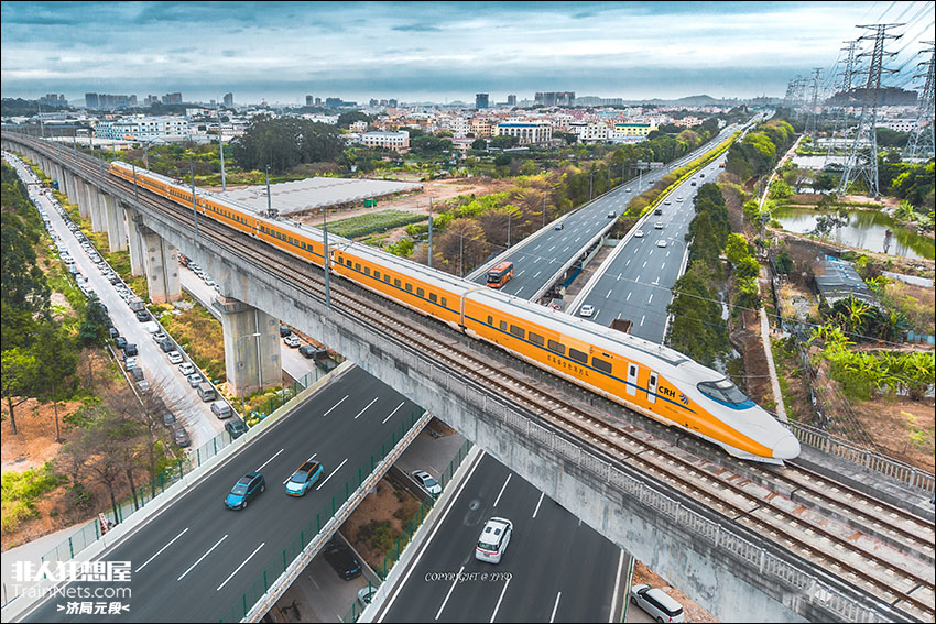 2025年2月,广东广州。CRH2J-0205综合检测车受委托担当广东城际管辖的广肇广惠城际线的半月检行驶在东环-官桥的高架区间,上跨南沙港高速路。
